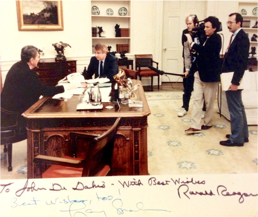Surprisingly, DeDakis found himself shipped off to Germany at the eleventh hour. His time as a campus reporter paved the way for him to spend the next two-plus years working for the military’s radio and television wing in Frankfurt. It was here that he interviewed Alfred Hitchcock. The 40-minute one-on-one with the five-time Academy Award nominee sealed the deal on a career path. Returning stateside in 1974, DeDakis resumed his pursuit of a BA in Journalism from the University of Wisconsin-Madison, earning the degree three years later. From 1976 to 1983, DeDakis was a reporter at WMTV (NBC-15) in Madison, a just-the-facts-ma’am journalist covering energy and transportation issues. Then, from 1983 to 1988, DeDakis was a General Assignment correspondent with CBN News in Virginia Beach, Virginia. Fortuitously, DeDakis was CBN’s White House correspondent during the last three years of Ronald Reagan’s presidency. In addition to interviewing Reagan, he also interviewed former president Jimmy Carter.