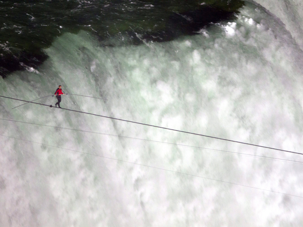 Niagara Falls took changing 100-year-old laws in two countries in order to get permission to walk over, so just the political part of that event was an overwhelming, monumental task. Then there was the training and the actual walk itself, followed by the network coming in last-minute and ordering me to wear a tether. That was something that I’d never done before. It’s like telling Tiger Woods that he’s got to use a specially weighted golf club instead of his trusty driver just before he tees off in a major. It’s going to throw him off because it’s different. It’s unique. And here I was, risking my life while people watching thought that the tether was going to save me. While that is true in in the purest sense, the reality is that a tether presented a risk as well. A tether could have caused me to fall. I could have gotten tangled up in it. The reality is, I’d trained for this walk without a safety. It was an extremely uncomfortable change, especially in a situation where I had never done it before and didn’t get to train with it on. But the network made the decision 10 days before the walk, and they were determined that I had to wear it. It was nonnegotiable.